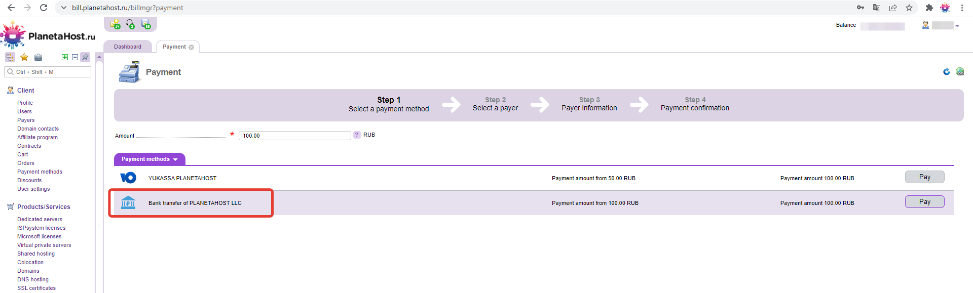 3. You need to choose a payment method and specify the amount by which you would like to add funds. Choose a payment method Bank transfer (LLC "PLANETAHOST") and indicate the amount of the account refill: