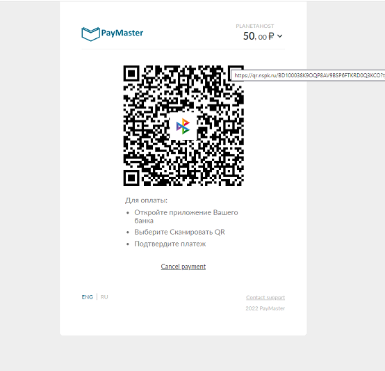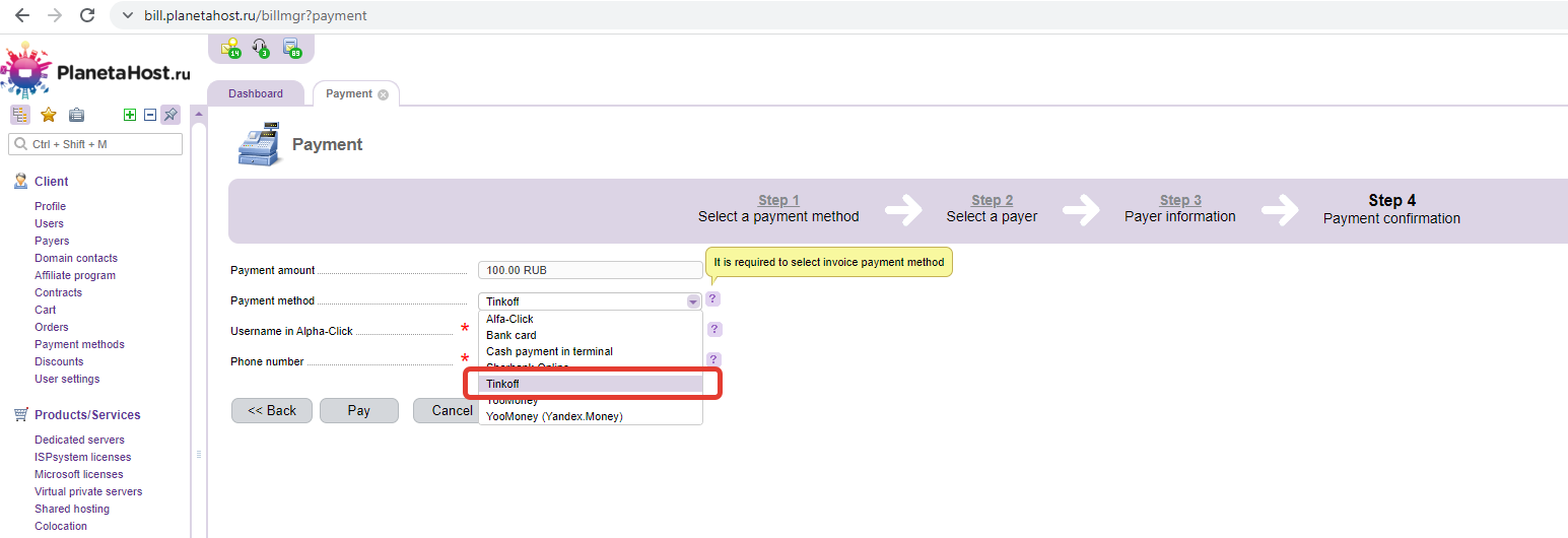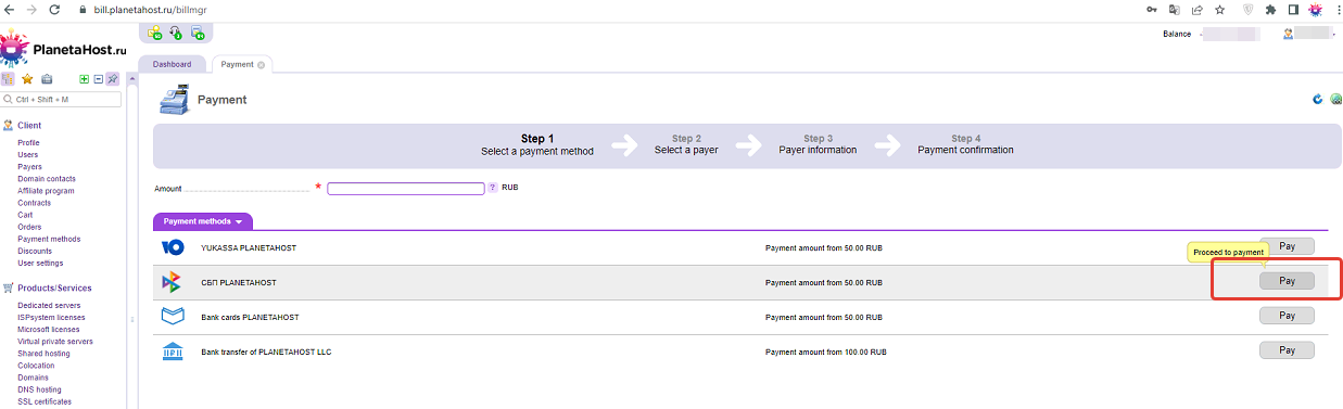 You need to choose a payment method and indicate the amount you would like to top up your account. We choose the payment method YooKassa (LLC "PLANETAHOST") and indicate the amount of replenishment of the account: