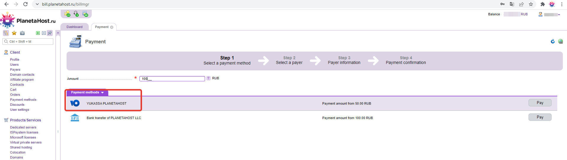 3. You need to choose a payment method and specify the amount by which you would like to add funds. Choose a payment method YooKassa (LLC "PLANETAHOST") and indicate the amount of the account refill: